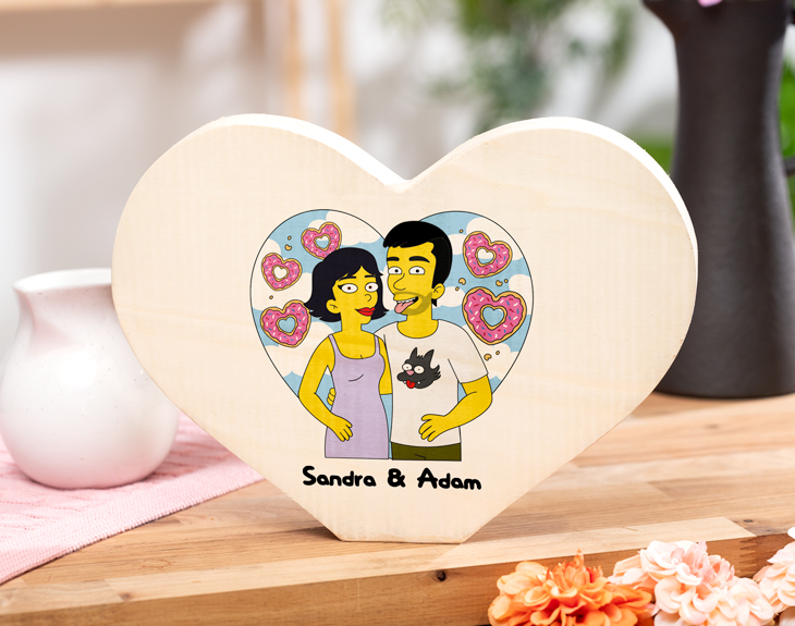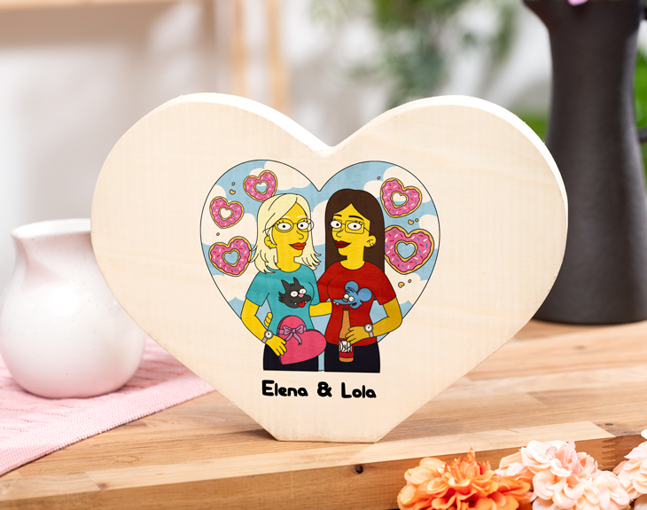 A la hora de buscar pareja, tenemos que fijarnos que cumpla con una serie de cualidades. Está claro que una característica imprescindible es que sea súper fan de la serie de Los Simpson. Si tú ya has encontrado a esa persona tan especial con la que hacer maratones de esta serie tan guay, tenemos el mejor regalo que le puedes hacer por San Valentín. Se trata de nuestro corazón de madera personalizado con diseño de "Pareja Simpson". Lo más guay que tiene es que puedes crear a esta pareja de Simpson como tú quieras. Imagina la ilusión que le hará a tu pareja recibir este regalo tan bonito, sin duda, le encantará. Personalizar este corazón de madera es súper sencillo. El primer paso a seguir consiste en añadir el producto al carrito y entrar al área de personalización. Una vez ahí, ya puedes crear a estos avatares Simpson desde cero, ¡ya verás que divertido!. Pronto estará perfecto y listo para regalar. ¡Será un original regalo para enamorados! Medidas: 30 x 22 x 3 cm. Importante: Las maderas tienen vetas y estas quedan reflejadas en la imagen.