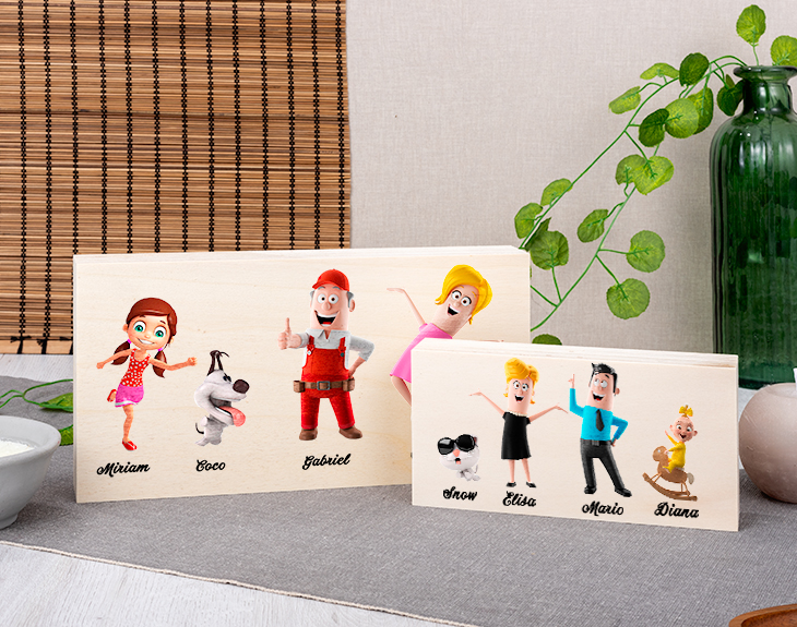 Ya puedes diseñar tu madera con nuestra familia 3D. Diseña esta madera personalizada como más te guste, con los personajes que más se asemejen a los miembros de tu familia, y decora la casa con este detalle tan divertido. Se trata de un regalo para toda la vida, realizado con madera de abedul con aproximadamente 3 cm de espesor. Tenemos dos tamaños disponibles: - 20 cm x 10 cm: puedes elegir hasta 6 personajes. - 30 cm x 15 cm: escoge hasta 8 personajes. Importante: Las maderas tienen vetas y estas quedan reflejadas en la imagen. Importante: a partir de 6 personajes, se distribuirán en dos filas. Es decir: - Familia de 6 personajes: 3 en la fila superior, y 3 en la inferior. - Familia de 7 personajes: 4 en la fila superior, y 3 en la inferior. - Familia de 8 personajes: 4 en la fila superior, y 4 en la inferior.