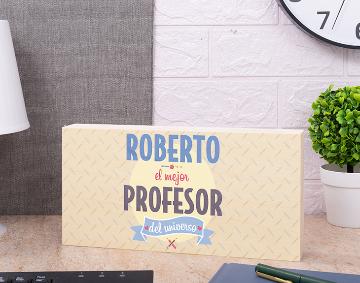 ¿Quieres darles una sorpresa a tu profe por el final de curso? Esta madera personalizada es el regalo perfecto para el mejor profe del universo. Solamente nos tendrás que decir su nombre y lo grabaremos en estas maderas tan originales. Es una bonita forma de agradecerle a tu profe lo mucho que has aprendido en sus clases y lo mucho que valoras su trabajo. Seguro que cuando se lo des tendrá una sonrisa de oreja a oreja y lo guardará con mucho cariño para siempre. Importante: Las maderas tienen vetas y estas quedan reflejadas en la imagen. Tenemos dos tamaños disponibles: - 20 x 10 cm. - 30 x 15 cm