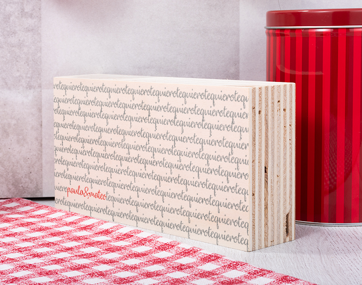 ¿Cuántas veces al día le dices "te quiero" a esa persona tan importante? Si son muchas menos de las que deberías, nuestra madera personalizada es una manera genial de demostrárselo. Si por el contrario, te pasas el día diciéndole lo muchísimo que le quieres, con esta madera conseguirás hacerlo de una forma mucho más original que no se esperará...¡Y es que no hay suficientes "te quiero" para expresar lo que sientes! Importante: Las maderas tienen vetas y estas quedan reflejadas en la imagen. Tenemos dos tamaños disponibles: - 20 x 10 x 4,2cm. - 30 x 15 x 4,2cm.