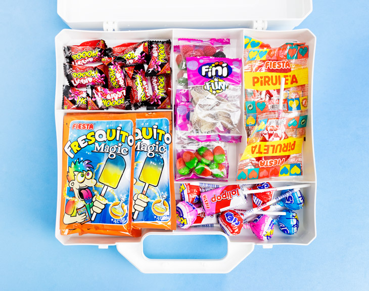 Contenido con cantidades aproximadas: • 10 Fresquitos • 18 Chicles bolón Boom liquid • 8 Mini-bolsas de chuches Fini (Coca-Cola, Moras, Fresas…) • 5 Piruletas de corazón • 12 palos de chicle (Kojak, Lolipop) • Maletín de plástico de 29cmx29cmx9cm • Tarjeta recordatoria ¿Cómo incluir los productos opcionales? Una vez hayas seleccionado el tipo de desayuno, en el apartado de adicionales (paso 2) podrás añadir todos los productos opcionales que quieras.