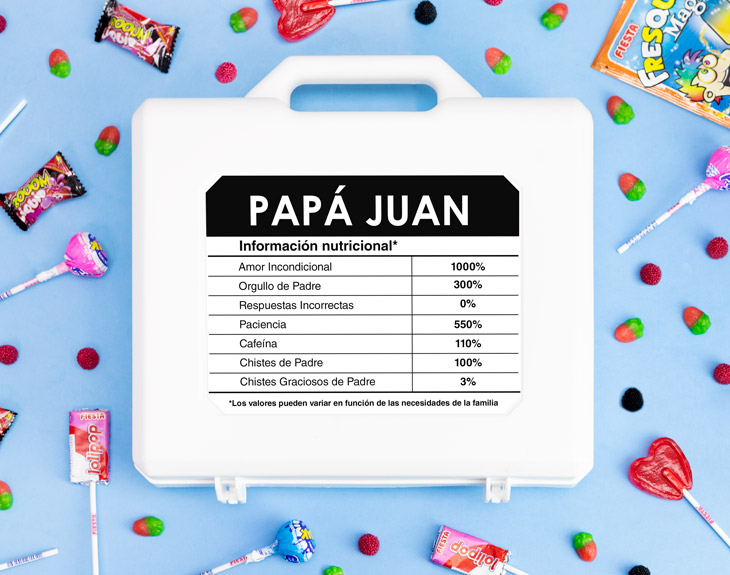 ¿Alguien sabe de qué están hechas las golosinas? Nosotros no lo sabemos, lo reconocemos, pero lo que sí sabemos es que están buenísimas. Da igual de que estén hechas, pero hay algo que las convierte en algo riquísimo. Todo tiene unos ingredientes concretos cuya combinación hace que sean perfectos y nos encanten. Tu padre también tiene los mejores ingredientes, obviamente, y eso es lo que le convierte en el mejor padre del mundo. Orgullo de padre, respuestas incorrectas, chistes graciosos... todo ello son ingredientes del mejor padre del mundo. Queremos que subas sus niveles de amor incondicional gracias a este maletín de chuches personalizado. Puede que sea el típico papá que siempre está comiendo gominolas, tumbado en el sofá después de una jornada laboral de lo más intensa. Si tu padre es esa clase de persona... ¡entonces este es el regalo perfecto! Este detalle tiene una variedad de las mejores chucherías, para que todos los paladares puedan disfrutar de sus chuches favoritas. ¿Tu padre es más de Fresquito o de chicle Boom? Independientemente de sus gustos, seguro que este regalo original le fascinará. Endulza el Día del padre con este maletín personalizado. Medidas: 29cmx29cmx9cm. Importante: si puedes tener reacción a cualquier tipo de alérgenos, puedes escribirnos para consultar si hay alguna opción alternativa.
