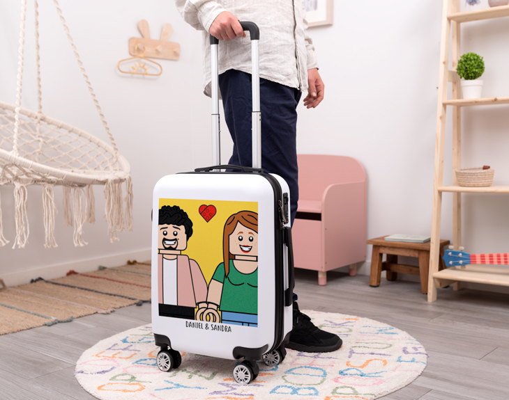 ¿Estás deseando que lleguen las vacaciones para pasar todo el tiempo del mundo con tu pareja? Esta maleta personalizada será la clave no solo para construir todos vuestros sueños... ¡También para cumplirlos a lo largo de vuestros viajes! En su interior cabrán todas esas cosas que no pueden faltar durante vuestras vacaciones. Si tienes a alguien en casa al que siempre le han encantados los juegos de construcción, esta maleta con diseño Lego es perfecta para él o ella. ¡Será la mayor prueba de amor posible! Cada uno de los compartimentos de la maleta tienen su propio cierre, que te vendrán genial a la hora de organizar tus vacaciones. ¡Tiene el tamaño justo para que tampoco vayáis cargados en vuestro viaje de aniversario! ¿Siempre has querido construir tu propio personaje Lego? Ahora con este regalo original para parejas podrás estar acompañado de tu amorcito para el resto de vuestras vidas. Solo tendrás que añadir el producto al carrito y entrar en el diseñador. Clica sobre cada símbolo de avatar para personalizar vuestro personaje. Después solo tendrás que ajustarlo a la plantilla y escribir el texto que quieras en la parte inferior. Tiene dimensiones de mano, con lo que podrás llevarla en el avión en la mayor parte de las aerolíneas (easyJet, Iberia, Vueling y muchas otras).