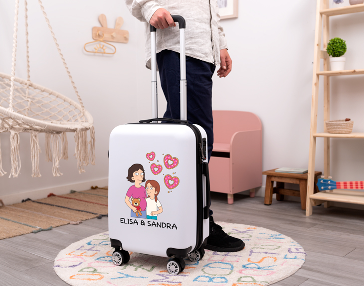 ¿Tú madre y tú siempre organizáis los mejores viajes del mundo? Si te encanta ir a recorrer el mundo y la mejor compañera que tienes para eso, es tu madre, regálale esta maleta tan especial. Será una demostración de lo mucho que la quieres y de lo que te encanta viajar a su lado. Es un regalo perfecto para el Día de la Madre, su cumpleaños o para alguna ocasión especial. ¡Acertarás seguro! El detalle más especial es que se puede personalizar, lo que quiere decir que tú podrás crear a estos personajes Cartoon. Tendrás para elegir entre un montón de opciones diferentes de accesorios y rasgos, seguro que consigues que estos dibujos os representen. Una idea genial de diseño, es personalizar el fondo con algo que os recuerde a las mejores vacaciones hayáis tenido juntos. Simplemente imagina la ilusión que le hará a tu madre recibir este regalo tan original, sin duda, cada vez que lo vea se acordará de ti y de lo mucho que la quieres. Olvidaos de perder la maleta o de confundiros con otras personas, porque como es personalizable ¡no habrá otra maleta igual! Tiene distintos compartimentos que hacen que se pueda aprovechar al máximo el espacio. El tamaño es de 55x35x20 centímetros aproximadamente y las ruedas giran 360º. A partir de ahora viajar será comodísimo y muy práctico, gracias a esta maleta. No esperes más y hazte con ella. ¡Vosotros seréis los protagonistas animados de vuestro viaje! Tiene dimensiones de mano, con lo que podrás llevarla en el avión en la mayor parte de las aerolíneas (easyJet, Iberia, Vueling y muchas otras).