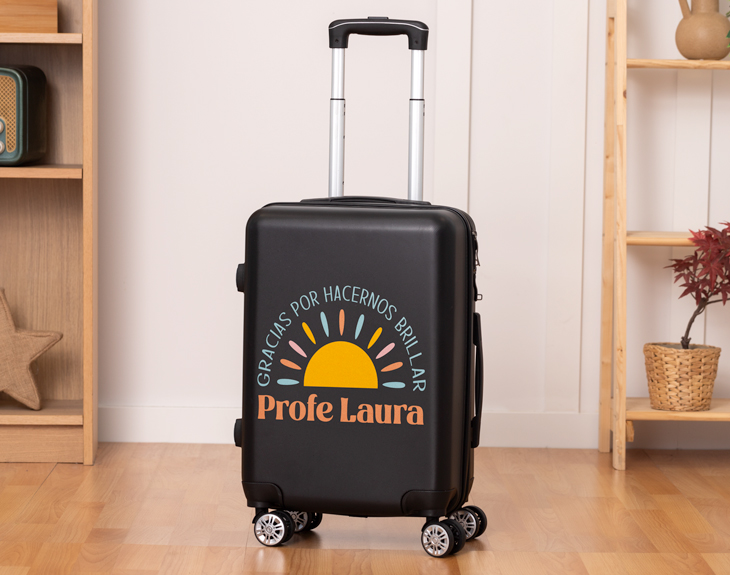 Esos profes que enseñan desde el corazón y consiguen sacar todo lo bueno de sus alumnos, sin duda, son los mejores. Y ahora que llega el verano, se merecen un buen descanso después de toda la paciencia que han tenido durante el curso. Por eso, si queréis que vuestro profe comience sus vacaciones de la mejor manera posible, tenemos el mejor regalo de todos. ¡Nuestra maleta personalizada con diseño "Nos haces brillar" es ideal! Además, ahora que el curso llega a su fin, esta maleta es la mejor despedida para vuestro profe. Es una forma de demostrarle lo mucho que lo admiráis y todo lo que disfrutáis de sus clases. Y lo mejor es que es personalizable, podrás escribir el nombre de ese profe. ¡Así nunca se olvidará de su clase favorita! Personalizar esta maleta es muy sencillo. El primer paso a seguir consiste en añadir el producto al carrito y entrar al área de personalización. Una vez ahí, ya puedes escribir el nombre del profe. Pronto estará perfecta y lista para regalar. ¡Será un original regalo para profesores! Además, tiene una distribución perfecta con distintos compartimentos para que pueda aprovechar el espacio al máximo. Asimismo, las ruedas giran 360º lo que la convierte en una maleta muy cómoda y práctica. Tiene dimensiones de mano, con lo que podrás llevarla en el avión en la mayor parte de las aerolíneas (easyJet, Iberia, Vueling y muchas otras).