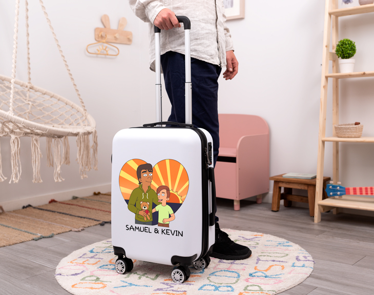 ¿En tu familia los viajes familiares son una tradición? ¿Ya estáis pensando en cuál será el siguiente destino? Esta maleta con diseño Cartoon es ideal para regalársela a tu padre, perfecta para tener un detalle con él por ser el mejor padre del mundo o para regalar por el Día del Padre o en su cumpleaños. Se convertirá en su mejor compañera de viaje y siempre se acordará de ti cada vez que la vea. Con esta maleta, os olvidaréis de perderla o de tener confusiones con otras personas, porque al ser personalizable ¡no habrá otra maleta igual! Cuenta con distintos compartimentos que hacen que se pueda aprovechar al máximo el espacio. El tamaño es de 55x35x20 centímetros aproximadamente y las ruedas giran 360º, el agarre es firme pero natural. Todas estas características hacen que sea una maleta cómoda y muy práctica, ideal para llevar a todos los viajes. Pero lo más especial de todo es que es personalizable. Lo que significa que tú vas a crear a tus propios personajes Cartoon. Para personalizar, lo primero es añadir el producto al carrito y entrar en el diseñador. Una vez ahí, ya podrás crear estos dibujos tan chulos. Imagina la cara que pondrá tu padre al ver esta maleta tan especial, sin duda, ¡le encantará! Tiene dimensiones de mano, con lo que podrás llevarla en el avión en la mayor parte de las aerolíneas (easyJet, Iberia, Vueling y muchas otras).
