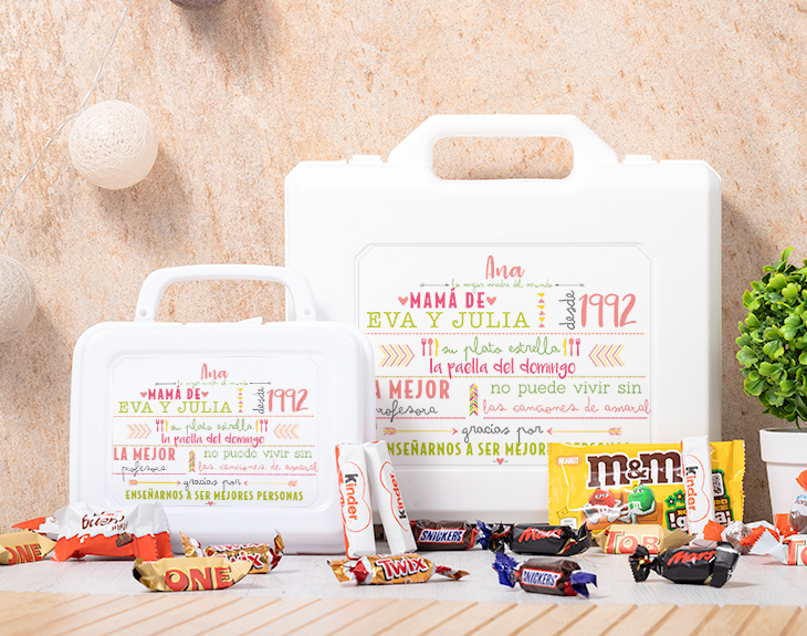 ¿Acaso hay algo mejor que celebrar una fiesta con una cantidad incalculable de golosinas? Estos dulces animan cualquier festividad y gustan a todo el mundo, independientemente de su edad. Da igual que seas un niño, un adulto, o un anciano: nadie se puede resistir a unas riquísimas chucherías. ¿Y a quién no le gustaría recibir un maletín de dulces personalizado repleto las mejores golosinas del mundo? Todas las madres se merecen un regalo de lo más dulce y rico para festejar su increíble maternidad, porque sí: todas las mamás son fantásticas, y hacen lo que sea para cuidar de sus pequeños. ¿Cuántas veces te ha llevado a los partidos de futbol de los sábados? ¿Recuerdas cuando te compraba tu helado favorito en esas calurosas tardes del mes de agosto? Gracias a este regalo, mamá recibirá una variedad de las mejores chucherías o chocolatinas, al mismo tiempo que rememorará esos preciosos momentos junto a ti. Sorprende a mamá con este regalo original para el Día de la Madre. Dentro de este chulísimo maletín personalizado, podrás encontrar dulces súper míticos. ¡Los mejores dulces para la mejor mamá del mundo! Personaliza el maletín con esos recuerdos imborrables y dale un detalle de lo más personal y emotivo! Medidas: - Maletín pequeño: 20 cm x 16 cm x 7 cm. - Maletín grande: 29 cm x 29 cm x 9 cm. Importante: • Si puedes tener reacción a cualquier tipo de alérgenos, puedes escribirnos para consultar si hay alguna opción alternativa. • En los meses cálidos del año, los productos Kinder Bueno Mini y mini barritas serán sustituidos por otros productos Kinder. • Las chocolatinas pueden variar según stock, pero no te preocupes estarán igual de deliciosas.