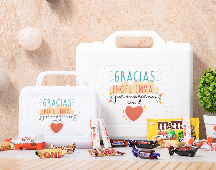 Enseñar es una vocación. Uno profesor necesita amar muchísimo su profesión para no caer en el agotamiento y el resentimiento hacia las clases. Los que consiguen superar ese sentimiento, se convierten en unos maestros alucinantes. Porque lo más importante para enseñar, más allá de tener todos los conocimientos necesarios para realizar esa tarea, es tener el corazón puesto en lo que se hace. Esos son los mejores profesores del mundo, los que enseñan con cariño, los que aman su profesión por encima de todas las cosas. ¿El profe de tus hijos es uno de estos magníficos profesionales que siempre están ahí cuando más lo necesitan? ¡Eso hay que celebrarlo! Y seamos sinceros, no hay mejor manera de hacerlo que con este maletín de dulces personalizado. ¡Queremos que tenga un regalo de lo más dulce! Por eso, contamos con dos tipos de maletines. Podrás escoger entre regalar un maletín de chucherías (con piruletas, chicles, Fresquitos, etc.), o uno repleto de chocolates (varios tipos de Kinder, Toblerone, M&Ms...). En ambos encontrarás una variedad de los mejores dulces. ¡No encontrarás un regalo original para profesores como este! Personalízalo con el nombre de ese maravilloso profe y déjale con la boca abierta. Medidas: 29 cm x 29 cm x 9 cm. Importante: • Si puedes tener reacción a cualquier tipo de alérgenos, puedes escribirnos para consultar si hay alguna opción alternativa. • En los meses cálidos del año, los productos Kinder Bueno Mini y mini barritas serán sustituidos por otros productos Kinder. • Las chocolatinas pueden variar según stock, pero no te preocupes estarán igual de deliciosas.