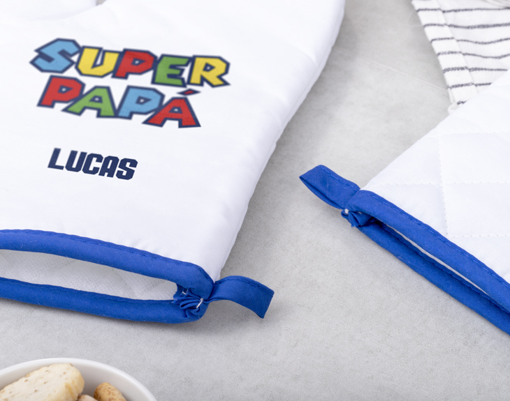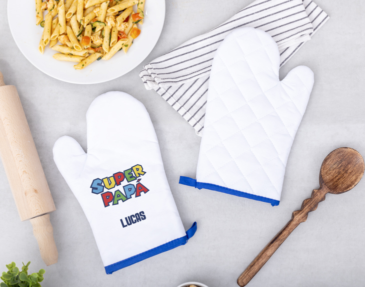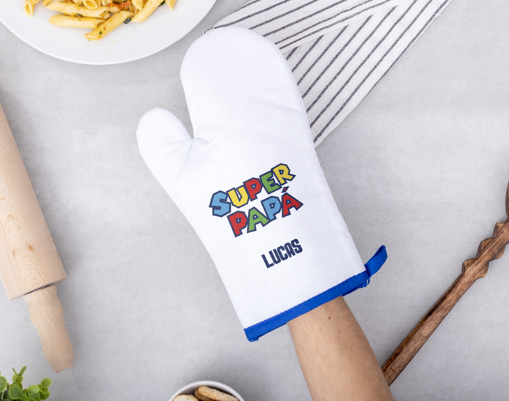 ¡Papá es el héroe de la casa! Pero incluso los mejores héroes pueden acabar quemados si no están bien equipados. Por eso, nuestra manopla de cocina personalizada "Superpapá Mario Bros", inspirada en el clásico videojuego de Mario Bros, es el accesorio perfecto para que tu papá siga cocinando sus deliciosos platos sin preocupaciones. Con el diseño de su personaje favorito, tu superpapá ahora estará listo para enfrentar cualquier hornada caliente, ¡y salvar el día! Imagina la cara de papá cuando reciba este regalo tan original en su Día. ¡Seguro que será el mejor regalo de todos! Además, esta manopla es personalizable: puedes poner el nombre de tu papá, y así, no quedarán dudas de quién es el verdadero chef de la casa. Para personalizar la manopla, solo añade el producto al carrito y ve a la sección de personalización. Escribe el nombre de tu superpapá y nosotros nos encargamos de crear este regalo único. ¡No dejes que se le quemen las manos y haz que se sienta como el héroe que es ¡Será un original regalo para padres!