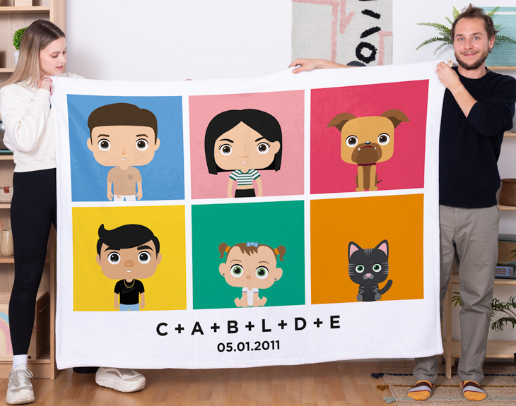 Si te encanta descansar en tu sofá y echarte una siesta después de un largo día, está claro que necesitas una buena manta para que te arrope. ¿Y qué mejor que nuestra manta personalizada Tinok Pop? ¡No encontrarás una igual! O si, por otro lado, eres más de los planes caseros, esta manta también es ideal para ver una peli con palomitas en el sofá, disfrutando de la compañía de familiares o amigos. Lo especial de esta manta es que es personalizable. ¡Tú creas tu propia manta Tinok Pop! Puedes diseñar los personajes como tú quieras y puedes elegir entre un montón de accesorios y rasgos diferentes. Tienes la posibilidad de crear entre uno a seis personajes distintos. Esta manta, sin duda, se convertirá en un regalo muy original, perfecto para regalar por cumpleaños, amigo invisible o en alguna ocasión especial. ¡Imagina lo bien que descansará esa persona bien arropada con esta manta tan chula! Y para personalizar esta manta, tienes que añadir el producto al carrito. Una vez ahí, entras al área de personalización. En el interior del diseñador encontrarás también los diferentes tipos de collages Pop con los que contamos, dependiendo del número de personajes escogido. Tendrás que clicar sobre el diseño que se ajuste al número de personajes. Por ejemplo, si escoges un total de 5 personajes para tu producto, tendrás que escoger el diseño titulado "5 personajes". Una vez escogido, podrás escribir el texto que quieras para tu diseño collage. ¡Podrás escribir desde los nombres de todos los miembros de la familia hasta una bonita dedicatoria! Ya hechos los diseños, solo queda terminar la compra y ¡nosotros nos encargamos de que quede una manta chulísima! Medidas: 170 x 130 centímetros. Las medidas pueden varias unos centímetros, son aproximadas. Material: polar, coralina o sherpa borreguillo.