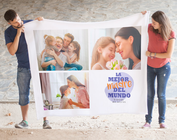 • Manta personalizada 170cm x 130cm. • Tarjeta recordatoria. Regalar a una persona tan importante como nuestra madre no siempre es fácil. Son muchos años buscando sorprenderla y, al final, se acaban por terminar las ideas. Sin embargo, cuando recurrimos a un regalo personalizado como el de nuestra manta collage Mejor madre del mundo, las posibilidades nunca dejan de aumentar. No solo conseguimos un detalle especial y emotivo si no que, además, seguro que le sacará mucho más partido y podrá presumir de ella con todas sus visitas. Nuestras mantas son blancas de base, para que vuestras fotos y diseño destaquen al máximo y, como comentamos, tendréis tres modelos de manta entre los que escoger. Todas las mantas se encuentran disponibles en medida de 170x130 centímetros, perfectas para cubrir a una persona adulta sin problema. Además, podéis lavarlas en la lavadora cuando estén sucias sin miedo a que el diseño se pierda, gracias a la técnica de impresión que usamos en este artículo. En cuanto al diseño, esta manta se personaliza con hasta tres fotografías y un texto. Para hacer la personalización, solo tienes que subir tus fotos escogidas al diseñador y seleccionarlas para colocarlas en cada viñeta de la manta. Por último, pincha en la última de las ventanas para anotar el texto que desees dedicar a tu madre y tendrás todo listo. Nosotros nos encargamos de reflejar tu diseño a todo color en la manta escogida y enviarlo a la dirección que nos indiques, lista para regalar. No habrá madre más emocionada que la tuya cuando descubra este regalo.