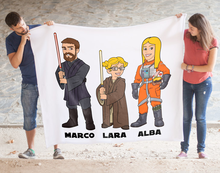 Siente más calorcito que en el planeta Mustafar con esta estupenda manta personalizada de Star Wars, con la cual podrás hacer que tu familia se convierta en parte del universo de George Lucas (y Disney). El procedimiento para personalizar es muy sencillo: elige hasta ocho personajes y haz que se parezcan a tus seres queridos. ¿Te imaginas ver las pelis arropado con una manta en la que tú y tu pareja sois Jedi? ¿O sorprender a tus sobrinos con una manta en la que son terribles Siths? ¡Todo es posible! Importante: nuestro equipo de personalización se encargará de ajustar la distribución de los personajes en el producto en función de su tamaño para que se vean lo mejor posible. Este producto ofrece tres opciones distintas de mantas, dependiendo del gusto de la persona a la que se le vaya a regalar. Si lo que más le apasiona es una manta aterciopelada, de esas que dan mucho gusto cuando te la pones encima, la manta polar es la mejor opción. Por otro lado, si prefieres una que sea muy calentita y suave, y te abrigue en las largas noches invernales, la manta coralina es perfecta para esa persona especial. Y por último nuestra manta sherpa que tiene un poco de ambas: el borreguillo más calentito y la suavidad de la manta coralina. Las medidas pueden variar unos centímetros, son aproximadas.