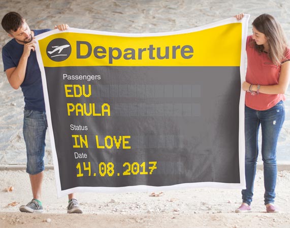 Si eres de los que pasas frío en aviones y aeropuertos, esta manta personalizada no faltará nunca en un viaje. Inspirada en los típicos paneles de llegadas y salidas, en ella ponemos el nombre de dos pasajeros, su status y la fecha de embarque. Al adquirir el producto (y antes de pagar) se te preguntará el texto para la manta. Las medidas pueden variar unos centímetros, son aproximadas.