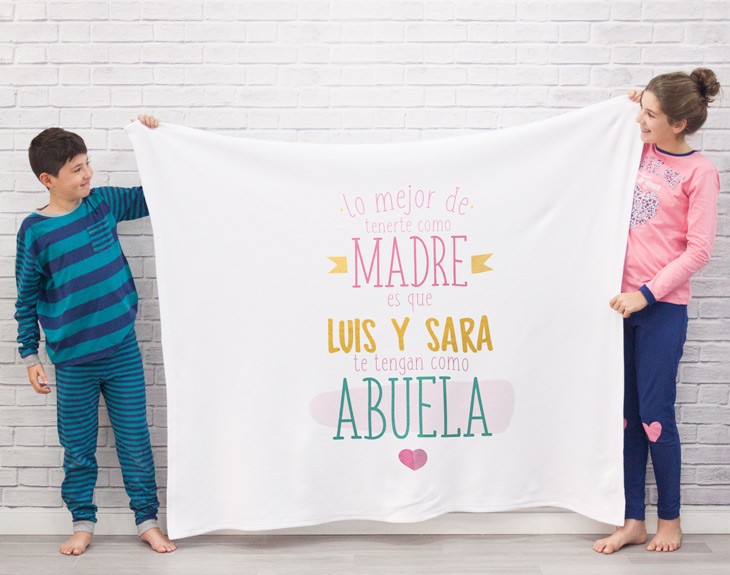 ¿Tus hijos adoran pasar tiempo junto a su abuela? Si no hay nada que les guste más que estar con ella escuchando todas sus historias y disfrutando de la comida más rica, esta manta personalizada es la mejor forma de demostrárselo. Además, se sentirá la mujer más especial y afortunada del mundo, y es que no todo el mundo recibe un detalle así de especial de parte de sus hijos y sus nietos. Solamente necesitamos que nos digas los nombres con los que quieres personalizar la manta y se quedará sin palabras al verla...¿No te parece un regalo de lo más emotivo? Las medidas pueden variar unos centímetros, son aproximadas.