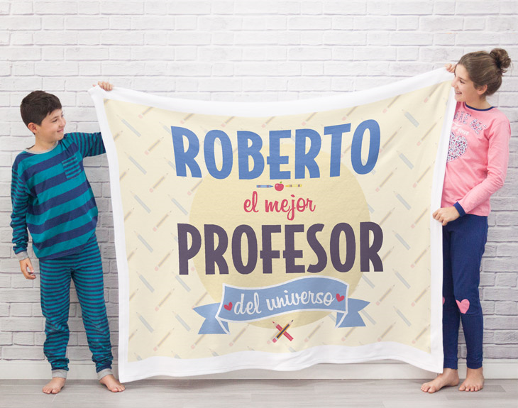 ¿Estáis buscando una forma original de sorprender a vuestro profe favorito? Esta manta personalizada es la opción perfecta. Es una bonita forma de agradecerle todo lo que habéis aprendido en sus clases este año. Además cada vez que se tumbe en el sofá con esta mantita tan divertida se acordará de sus alumnos favoritos. Simplemente nos tendréis que decir el nombre de vuestro profe y nosotros lo añadiremos a este diseño tan chulo. ¿No os parece una idea genial? Las medidas pueden variar unos centímetros, son aproximadas.