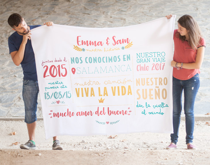 ¿Estás viviendo la historia de amor más bonita de todas? Entonces esta manta personalizada es perfecta para sorprender a tu pareja y recordar los mejores momentos que habéis vivido juntos. El año en el que os conocisteis, vuestra primera cita, esa canción que ha pasado a ser la banda sonora de vuestro amor o ese viaje en el que compartisteis miles de aventuras. ¡Solo tienes que hacer un poco de memoria para decirnos todos estos datos y le podrás regalar la manta más especial del mundo! Y es que partir de ahora las tardes de domingo y sofá viendo vuestra serie favorita serán aún más increíbles. ¿No te parece una gran idea? Este producto ofrece tres opciones distintas de mantas, dependiendo del gusto de la persona a la que se le vaya a regalar. Si lo que más le apasiona es una manta aterciopelada, de esas que dan mucho gusto cuando te la pones encima, la manta polar es la mejor opción. Por otro lado, si prefieres una que sea muy calentita y suave, y te abrigue en las largas noches invernales, la manta coralina es perfecta para esa persona especial. Y por último nuestra manta sherpa que tiene un poco de ambas: el borreguillo más calentito y la suavidad de la manta coralina. Las medidas pueden varias unos centímetros, son aproximadas.
