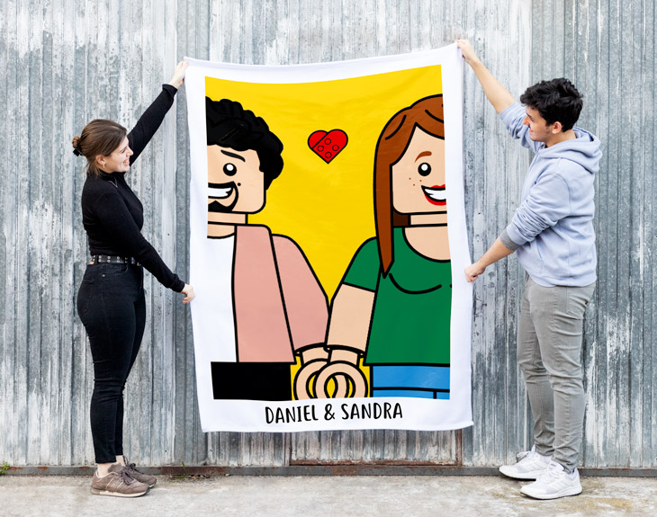 ¿A quién no le gusta acurrucarse junto al amor de su vida en el sofá de casa? La llegada del invierno hace que puedan suceder este tipo de planes tan bonitos como románticos. ¿Y por qué no hacerlo de una forma única? Esta manta personalizada será el regalo perfecto para esos días de frío extremo en los que solo nos apetece estar con nuestra pareja. No hay nada como estar en el sofá bien calentito, y esta experiencia será todavía más única gracias a esta manta con diseño de pareja Lego. Todas nuestras mantas tienen unas medidas de 170 por 130 centímetros, por lo que no tendréis ningún problema a la hora de taparos los dos. Escoge el material que quieras entre las tres opciones disponibles: polar, coralina y sherpa borreguillo. ¡Seguro que se quedará con la boca abierta! Si a tu novio/a siempre le han encantado los sets de construcción Lego, este regalo original es perfecto para él o ella. Podrás crear vuestras propias figuras de Lego en el interior del diseñador, clicando sobre la plantilla para entrar en el diseñador de personajes. ¡Crea tu avatar con todas las características que quieras! Además, podrás elegir el color para el fondo entre las opciones disponibles. ¡Es el regalo perfecto para los más nostálgicos! Medidas: 170 x 130 centímetros. Material: polar, coralina o sherpa borreguillo. Las medidas pueden varias unos centímetros, son aproximadas.