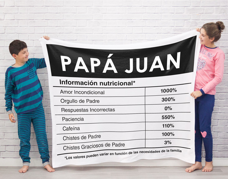 No hay mejor regalo para un padre que agradecerle todo lo que es y ha hecho por ti. Sus chistes graciosos y los que no lo son tanto, la paciencia que tiene contigo, cómo lo sabe todo... Si fuera un alimento, ¡sería el de los mejores ingredientes! Por ello, ahora puedes darle las gracias por todo con esta manta personalizada con el diseño de las etiquetas de los alimentos. Seguro que tu papá también cumple todos estos estándares. Por ello, podrás personalizar la manta con su nombre escrito en todo lo alto. Dínoslo una vez tengas el producto en el carrito y ya verás lo chulo que queda en la previsualización. Sin duda, tendrás un fantástico regalo original para padres. Si quieres enviar esta manta para el día del padre, puedes seleccionar la dirección y el día que quieras. ¡Nosotros daremos la sorpresa por ti! Las medidas pueden variar unos centímetros, son aproximadas.