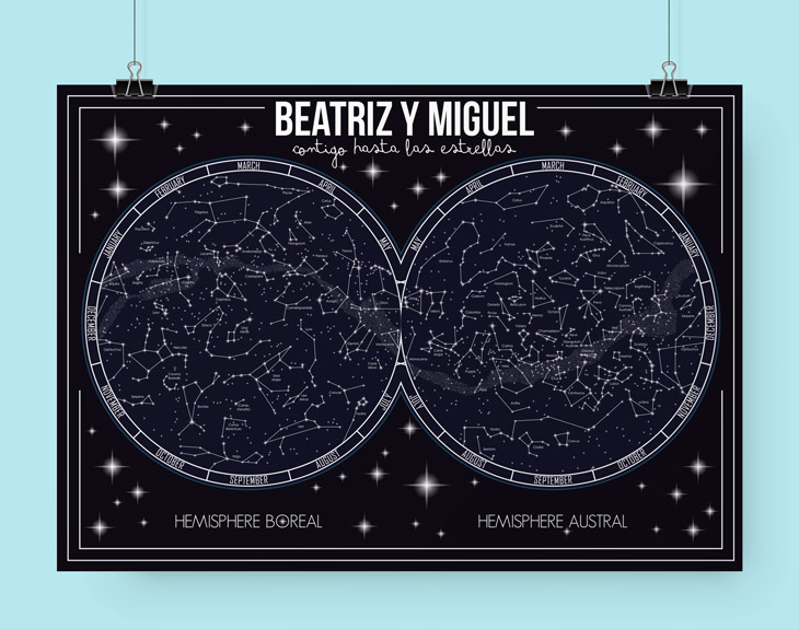 • Mapa de constelaciones personalizado. • Tarjeta recordatoria.