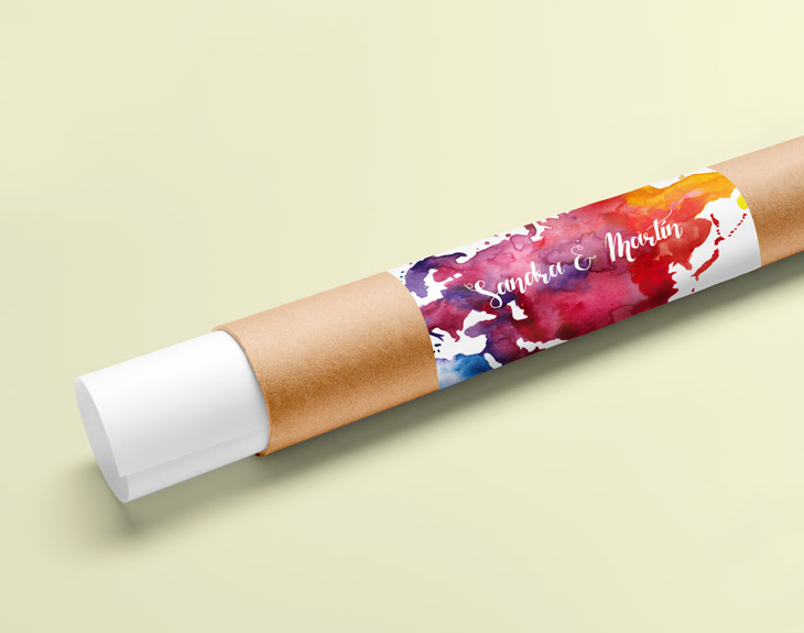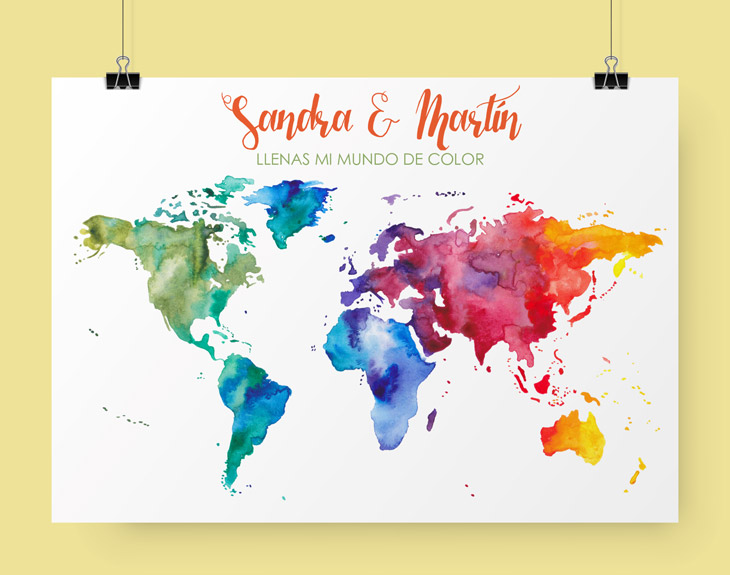 ¿Llegas de un viaje y ya estás pensando en el siguiente? ¿Siempre viajas con tu pareja o con la persona más increíble que conoces? Ahora puedes personalizar este mapa y darle una sorpresa. ¿No sabéis qué país elegir esta vez? Con este mapa lo tendréis todo más claro. Si sois de los que vivís la vida llena de color, este diseño de acuarela está hecho para vosotros. Solo tendrás que darnos los nombres y un texto inferior para poder hacer exclusivo el mapa y sorprender a ese compañero o compañera de viaje. ¿Cuántas veces has deseado dar la vuelta al mundo con esa persona? ¡Este puede ser un buen comienzo. Tenemos dos tamaños distintos disponibles: - Póster grande: 85 cm x 60 cm - Póster pequeño: 21 cm x 29,7 cm (A4) Además, puedes elegir la opción con tubo para poder guardar el mapa, y darle una sorpresa mucho mayor. El tubo está disponible en ambas opciones, y va personalizado con una pegatina.