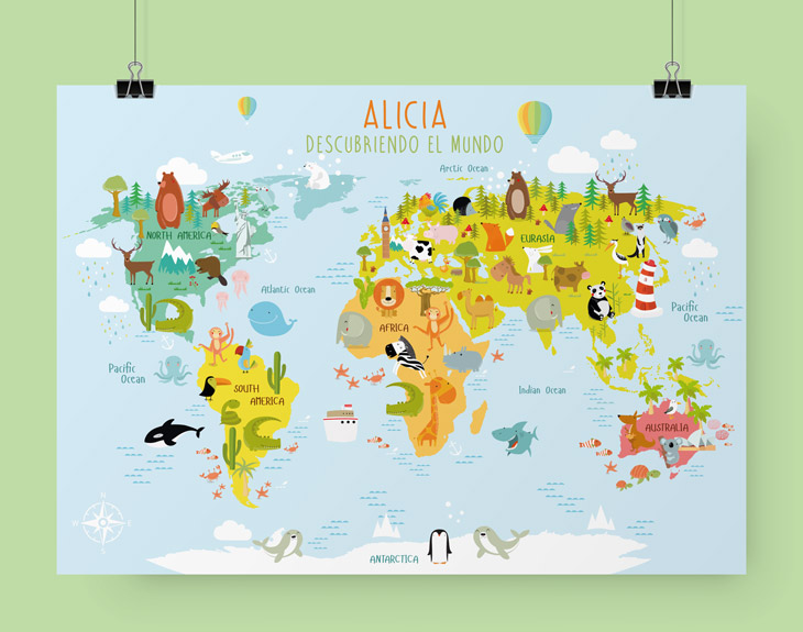 ¿Tu hija está aprendiendo a reconocer los diferentes animales? ¿Sois una familia súper viajera? Este mapa del mundo personalizado es perfecto para sorprender a la princesa o al príncipe de la casa. Se trata de un mapa con un diseño infantil ideal para decorar la habitación de los pequeños de la familia, pero también es un regalo educativo: podrá aprender a reconocer los animales y los diferentes continentes. Para personalizar el mapa solo tendrás que darnos su nombre y un texto para añadirlo debajo. Aprovecha la oportunidad para darle una sorpresa de las que no se olvidan. Tenemos dos tamaños distintos disponibles: - Póster grande: 85 cm x 60 cm - Póster pequeño: 21 cm x 29,7 cm (A4) Además, puedes elegir la opción con tubo para poder guardar el mapa, y darle una sorpresa mucho mayor. El tubo está disponible en ambas opciones, y va personalizado con una pegatina.
