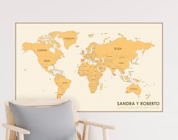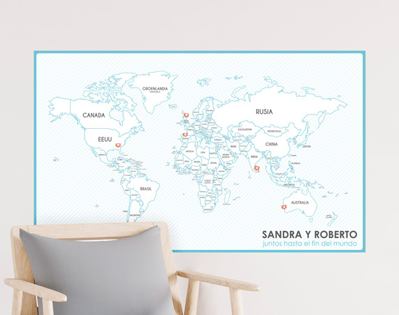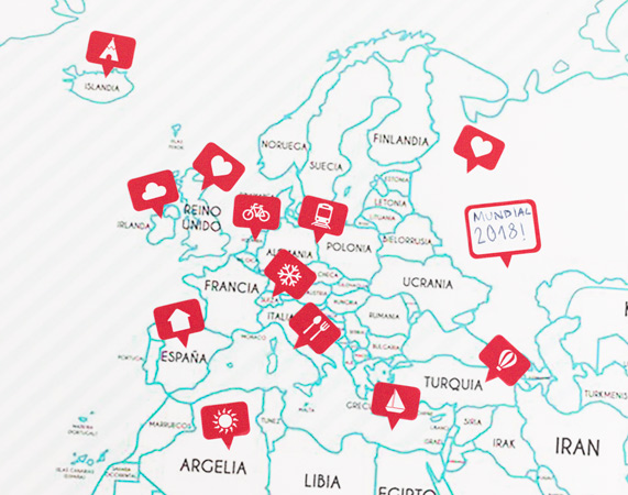 Nuestro mapa del mundo personalizado está preparado para que lo llenes de pegatinas de un montón de experiencias vividas en tus viajes. Incluye un pack de pegatinas de todo tipo que podrás ir pegando en el mapa según visites los países y vivas experiencias locales. Este mapa de mundo es perfecto para sacarle una sonrisa a tu compañero de viaje más fiel. Te preguntaremos nombre o nombres y un texto breve que le dé todavía más sentido al regalo. ¡Es un mapa perfecto para guardar todos los recuerdos viajados por el mundo entero!
