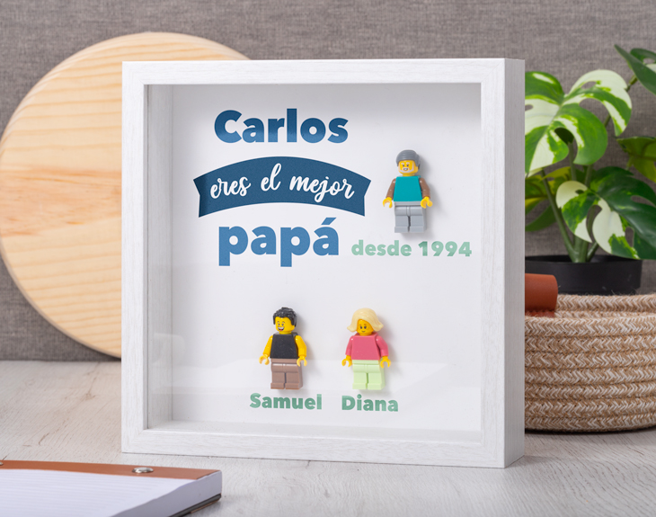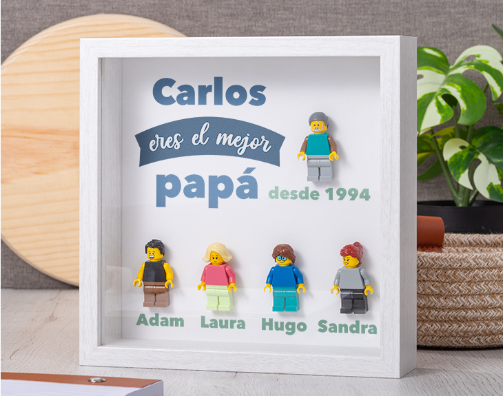 ¿Quién es esa persona que siempre está tanto en lo bueno como en lo malo? ¿Que siempre te apoya y te ayuda en todo lo que necesitas? Si para ti esa persona es tu papá, está claro que tienes que darle las gracias con un regalo a su altura. Si se acerca alguna fecha especial como su cumpleaños, el Día del Padre o un amigo invisible, tenemos el detalle perfecto que le puedes hacer. Se trata de nuestro marco con minifiguras lego con diseño "Mejor Papá". ¡Le encantará! Y es que si cuando eras pequeño te pasabas las tardes enteras jugando con tu papá con las famosas piezas Lego, está es la mejor de agradecerle por esos buenos momentos. Con nuestro marco, podrás crear a estas minifiguras como tú quieras. ¡Seguro que consigues que os representen a todos tus familiares, ¡tendrás a tu propia familia Lego! Por último, te explicamos como diseñar a estas minifiguras. El primer paso a seguir consiste en entrar en nuestro diseñador. Una vez ahí, ya puedes elegir las características de tu figura Lego y nosotros nos encargamos de montar las piezas para crear a una familia de Legos igualitos a vosotros. Pronto estarán perfectos y listos para regalar. ¡Será un original regalo para fans de Lego! Medidas marco: 20cm x 20cm x 5cm. Medidas figuras Lego: 4cm de alto. Importante: este producto contiene una pequeña ranura en la parte superior. En el caso de que una pieza no esté disponible, se sustituirá por otra similar.