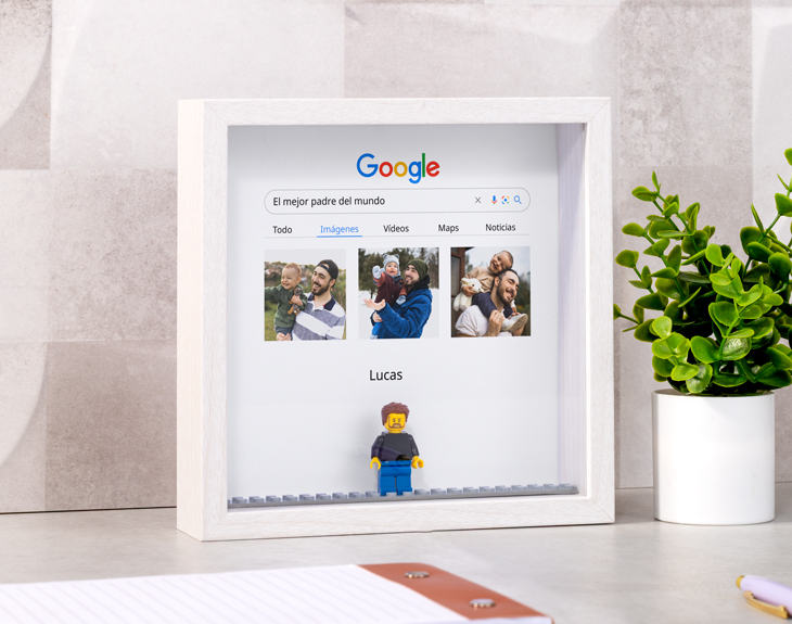 Se acerca el Día del Padre y, seguro, ya has estado buscando el regalo perfecto para sorprender a papá. ¡No busques más! Tenemos justo lo que necesitas: nuestro ¡marco de madera con minifigura Lego! Con el diseño "Buscador Google Papá", podrás demostrarle todo lo que significa para ti de una manera diferente, emotiva y divertida. Lo que hace único y especial a este marco es que es personalizable. Puedes incluir tres de tus fotos favoritas con papá y, ¿la mejor parte? ¡Podrás crear la minifigura Lego que más se asemeje a él! Gracias a nuestra variedad de piezas, podrás representarlo a la perfección. Imagina la emoción cuando lo reciba, ¡Ideal para decorar su hogar con fotos especiales y un toque divertido! ¿Cómo personalizarlo? Es muy sencillo. Solo tienes que añadir el producto al carrito, acceder al área de personalización y diseñar tu minifigura Lego. Después, sube tus fotos favoritas desde tu dispositivo. ¡Y listo! En breve recibirás este regalo original para el Día del Padre. Medidas marco: 15 cm x 15 cm x 5 cm Medidas figura Lego: 4cm de alto. Importante: este producto contiene una pequeña ranura en la parte superior. En el caso de que una pieza no esté disponible, se sustituirá por otra similar.