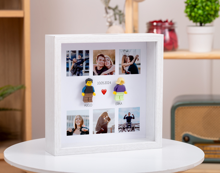 • Marco blanco de madera 20 cm x 20 cm con minifiguras Pareja Lego. • Tarjeta recordatoria.