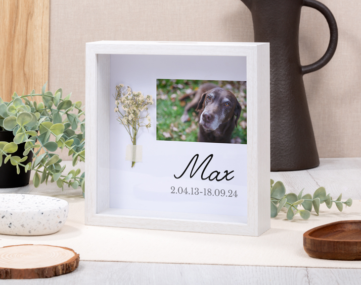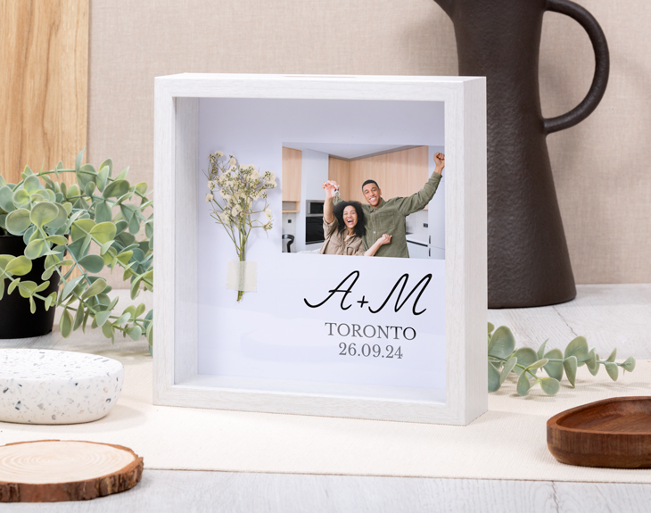 • Marco blanco de madera 20cm x 20cm x 5cm personalizado. • Tarjeta recordatoria.