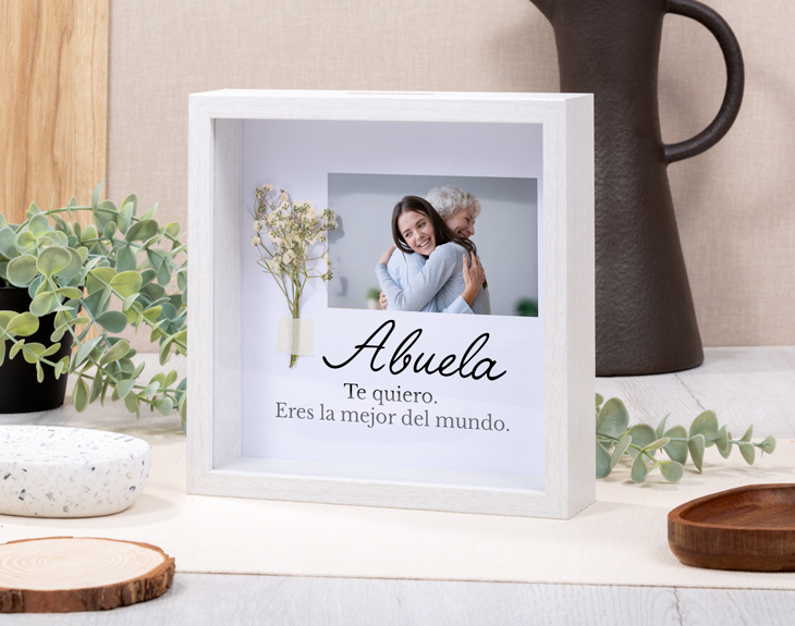 ¡Todos los abuelos son maravillosos! Son esas personitas que siempre nos cuidan y nos miman un montón. Por eso, se merecen todo lo bueno de este mundo. Si este año queréis sorprender a vuestra abuela, tenemos el mejor regalo de todos. Se trata de nuestro marco con ramo personalizado con diseño "Te quiero abuelo/a". ¡Es precioso! Este marco es genial para ponerlo en cualquier rincón de la casa. ¡Cada vez que lo vea se acordará de lo mucho que lo queréis! Además, lo mejor es que es personalizable. ¡Podrás escribir el nombre de tu abuelito/a! Imagina la ilusión que le hará recibir este regalo tan bonito, sin duda, le encantará. Personalizar este marco con ramo es muy sencillo. El primer paso a seguir consiste en añadir el producto al carrito y entrar al área de personalización. Una vez ahí, ya puedes escribir el nombre de la mejor abuela del mundo. Pronto estará perfecto y listo para regalar. ¡Será un original regalo para abuelos! Importante: este producto contiene una pequeña ranura en la parte superior. Medidas marco: 20cm x 20cm x 5cm.