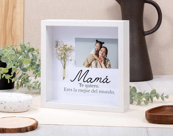 ¿Quién es esa persona que siempre está ahí para ti, tanto en lo bueno como en lo malo? Seguro que la primera persona en la que has pensado ha sido en tu mamá. ¡Y es que todas las madres son maravillosas! Por eso, se merecen todo lo bueno de este mundo. Si quieres sorprenderla con un precioso regalo, nuestro marco con ramo personalizado con diseño "Te quiero mamá" es ideal. Sin duda, es una preciosa forma de demostrarle a la mejor mamá de todas lo mucho que la quieres y todo lo que significa para ti. Ya sea por el Día de la Madre, por su cumpleaños o por cualquier ocasión especial, este marco con ramo será el realo perfecto. Además, lo mejor que tiene es que es personalizable. Podrás escribir lo que tú quieras, le encantará. Personalizar este marco con ramo es muy sencillo. El primer paso a seguir consiste en añadir el producto al carrito y entrar al área de personalización. Una vez ahí, ya puedes escribir el nombre de la mejor mamá del mundo. Pronto estará perfecto y listo para regalar. ¡Será un original regalo para madres! Importante: este producto contiene una pequeña ranura en la parte superior. Medidas marco: 20cm x 20cm x 5cm.