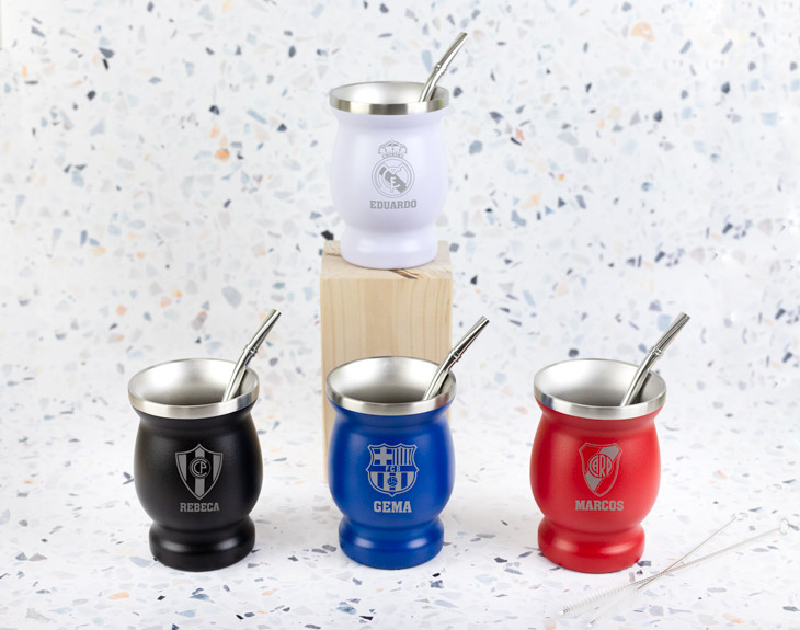 Este mate con nombre grabado está hecho de acero inoxidable y cuenta con una altura de 11 centímetros. Además cuenta con una doble pared, con lo que se podrá mantener la temperatura todo el tiempo posible, y una capacidad de 250 mililitros. ¿Qué tendrás que hacer para regalar a tu amigo más futbolero? Solo tendrás que escribir el nombre de su equipo favorito en el área de personalización. ¡Nosotros nos ocuparemos de plasmar el escudo en este regalo original! Podrás escoger el color que quieras para tu mate entre los cuatro disponibles: azul, blanco, negro o rojo.