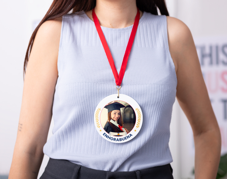 ¡El verano ya está! Por fin las clases terminan y comienzan las esperadas vacaciones. Ahora toca despedirse de todos los compañeros y profesores del curso. Se acerca también el día más especial de todos: la graduación. ¡Es el cierre de una gran etapa, llena de momentos felices, trabajos y exámenes! Si alguien cercano se gradúa dentro de poco o tú mismo vas a pasar por esta situación, esta medalla redonda personalizada con diseño "Graduación" puede ser el regalo perfecto para ese momento tan especial. Lo más especial es que es personalizable, podrás poner una foto junto con el nombre de esa persona tan especial. ¡Le hará muchísima ilusión! Personalizar esta medalla es muy sencillo. El primer paso a seguir consiste en añadir el producto al carrito y entrar al área de personalización. Una vez ahí, ya puedes escribir el nombre del mejor profe. Pronto estará perfecta y lista para regalar. ¡Será un original regalo para profesores! Diámetro: 10 centímetros. Material: metacrilato.