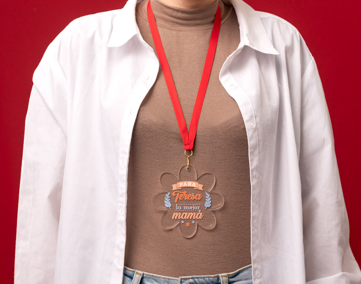¿Cuál puede ser la flor más bonita que le puedes regalar a mamá? ¡Aquella que le deje claro que es la mejor madre del mundo! Esta medalla de metacrilato personalizada está hecha como premio a esas mamis que siempre han apoyado y cuidado a su familia a lo largo de su vida. ¡Podrá colgársela del cuello a lo largo de ese día de celebración! No habrá una mejor forma de homenajear a tu madre que con esta medalla de metacrilato flor con diseño para mamá. ¡Está diseñada como si fuera una flor! Al estar hecha de metacrilato transparente se puede ver el diseño sin problema... ¡Un diseño específico para la madre más guay! Cuenta con una medida de 10 centímetros, tanto de alto como de largo. ¡Será la mejor forma de sorprender a mamá! Este regalo original es perfecto para dejar a mamá con la boca abierta. ¡Podrás colgársela tú mismo/a del cuello gracias a su cuerda roja! En el interior del área de personalización podrás terminar el diseño con el nombre de mamá, el cual tendrás que escribir en el cuadro de texto que encontrarás en la plantilla. Medida: 10 centímetros. Material: metacrilato.