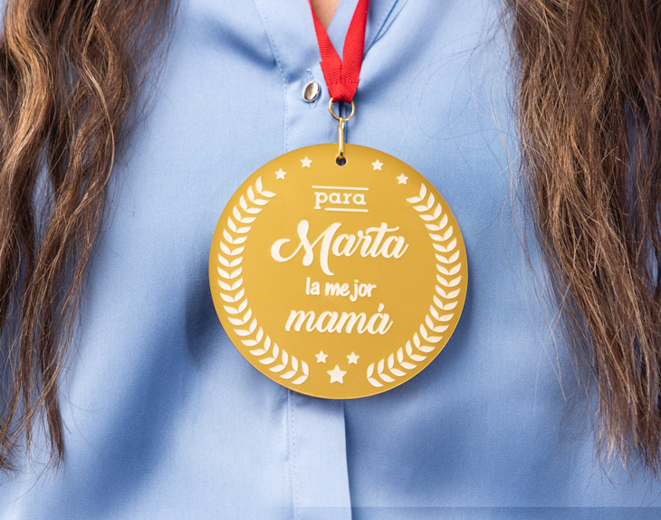 Una madre tan buena como la tuya se merece una recompensa por todo el trabajo que ha hecho a lo largo de los años: cuidándote, llevándote al cole, preparando la cena... ¡Es el momento de sorprenderla con una medalla de metacrilato personalizada como esta! Está hecha de color dorado y de forma exclusiva para la mejor mamá del mundo. Si tu madre es siempre la que te salva en el día a día desde que tienes uso de razón, esta medalla de oro con forma circular y diseño de mamá es perfecta para ella. Esta medalla está hecha de metacrilato de color dorado, para remarcar que tiene el primer premio en ser la mejor mamá. Cuenta con 10 centímetros de diámetro y una cuerda de color rojo, perfecta para colgársela a mamá. Esta medalla es un regalo original perfecto por el Día de la Madre, ya que podrás honrarla de la mejor forma posible. ¡Así sabrá cuánto la quieres! Una vez añadas el producto al carrito podrás personalizarlo en el interior del área de diseño. ¡Escribe su nombre en esta medalla y nosotros nos encargaremos de grabar el diseño en el metacrilato dorado! Diámetro: 10 centímetros. Material: metacrilato.