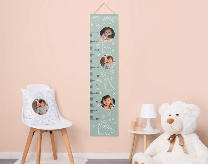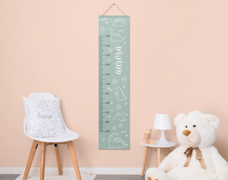 ¡El tiempo se pasa volando! Especialmente para los niños, crecen muy rápido y muchas veces podemos pensar que no disfrutamos lo suficiente de ellos cuando son pequeños. Es importante no perdernos ningún avance en su crecimiento, por eso este medidor personalizado es perfecto para ponerlo en el cuarto de nuestros hijos y que ellos mismos puedan medirse siempre que quieran. Es un momento genial para compartir en familia y ver los avances de cada día. ¡Seguro que le encanta tener su propio medidor! Este original medidor con dinosaurios es el elemento perfecto para decorar cualquier rincón de la habitación de los más pequeños. Este producto contiene una tela de lienzo en la que irá impreso el diseño, dos listones de madera para poder desplegarlo y una cuerda que sirve para colocarlo donde quieras. Este medidor se ganará un hueco en el corazoncito de tu hijo o hija y se convertirá en su rutina diaria medirse para ver cuánto ha crecido. Podrás medir desde los 60 hasta los 150 centímetros. Pero recuerda que tienes que personalizar tu medidor para hacer que sea el mejor del mundo. Podrás elegir qué tipo de personalización quieres entre las dos opciones que te ofrecemos: texto o foto. ¿Con cuál te quedas? Añade el nombre que quieras o tus fotos favoritas y disfruta de este medidor en familia. Medidor desde 60 cm a 150 cm. Material: lienzo de algodón de alta calidad.