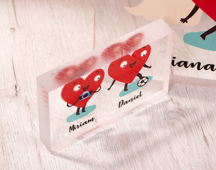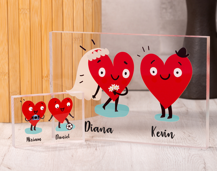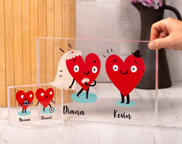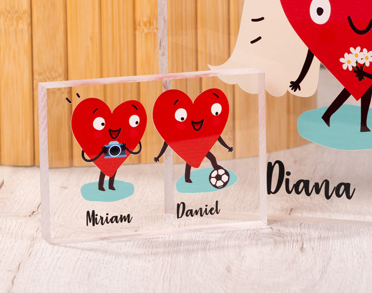 Regala amor con nuestra familia corazones, con la cual podrás representaros en forma amorosa y convertiros en un metacrilato que será perfecto para decorar cualquier estancia. El funcionamiento es bien sencillo: elige a los personajes (podéis ser tu pareja y tú, toda la familia, incluso incluir mascotas...), pon los nombres y nosotros nos encargaremos del resto. Recibiréis un metacrilato que, tal y como hemos dicho, será perfecto para decorar la salita de estar, la mesa del trabajo o cualquier otra estancia en la que quieras que tanto amor esté a la vista. Tenemos hasta cuatro tamaños diferentes: - 29,5 x 19,5 x 2 cm. - 15,5 x 9,5 x 2 cm. - 13 x 13 x 2 cm. - 9 x 13 x 2 cm.