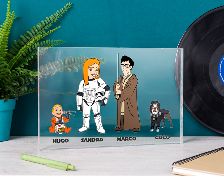¿Buscas un regalo de otra galaxia? En ese caso, este metacrilato personalizado es justo lo que necesitas. En él podrás hacer que los miembros de tu familia, tus amigos o tus compañeros de trabajo se conviertan en personajes de Star Wars. ¡Es muy sencillo! Solo tendrás que elegir entre los diferentes personajes, a los cuales les podrás poner el nombre que quieras. Presume de familia con este estupendo metacrilato, con el cual podrás hacer que la mesa de tu despacho, la estantería del salón o el mueble del recibidor sean los mejores de esta zona de la galaxia. Medidas: - 29,5 x 19,5 x 2 cm. - 15,5 x 9,5 x 2 cm. - 13 x 13 x 2 cm. - 9 x 13 x 2 cm. Importante: a partir de 6 personajes. se colocarán en dos filas. Es decir: - Familia de 6 personajes: 3 en la fila superior, y 3 en la inferior. - Familia de 7 personajes: 4 en la fila superior, y 3 en la inferior. - Familia de 8 personajes: 4 en la fila superior, y 4 en la inferior.