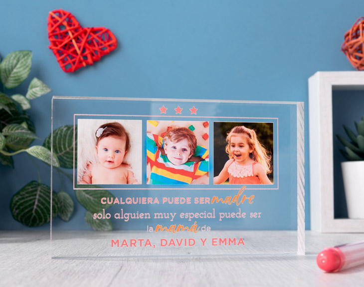 ¡Madre solo hay una en el mundo! Por eso, no hay nadie que pueda compararse con ella, es la persona más importante de nuestra vida y la unión de una madre con sus hijos es algo único. Por todos estos motivos, cualquier madre se merece en algún momento un súper detalle como este metacrilato personalizado. En él podrás dejar claro que tu madre es la más especial por estar siempre contigo pase lo que pase. Porque cualquiera puede ser madre, pero como la tuya seguro que no hay ninguna. Hay ocasiones y fechas importantes que son perfectas para consentir y mimar a las mamás, como el Día del Madre o su cumpleaños. En esos momentos, no hay nada más especial que hacerle un regalo único como este original metacrilato para madres que seguro que le encanta. Estará deseando ponerlo en su rincón favorito de casa o en su mesa de la oficina para que todo el mundo lo vea y ser la envidia del trabajo. ¡Es un recuerdo muy bonito! Pero si quieres que esta sorpresa sea única, no te olvides de personalizar tu propio metacrilato. Hacerlo es muy sencillo. Primero añade el producto al carrito y selecciona el tamaño del metacrilato que quieres. Después, podrás empezar con la personalización. Añade tus fotos favoritas y uno o varios nombres en la parte inferior, podrás previsualizar en todo momento el diseño para ver como será el resultado final. Disponible en cuatro tamaños diferentes: - 29,5 x 19,5 x 2 cm. - 15,5 x 9,5 x 2 cm. - 13 x 13 x 2 cm. - 9 x 13 x 2 cm.