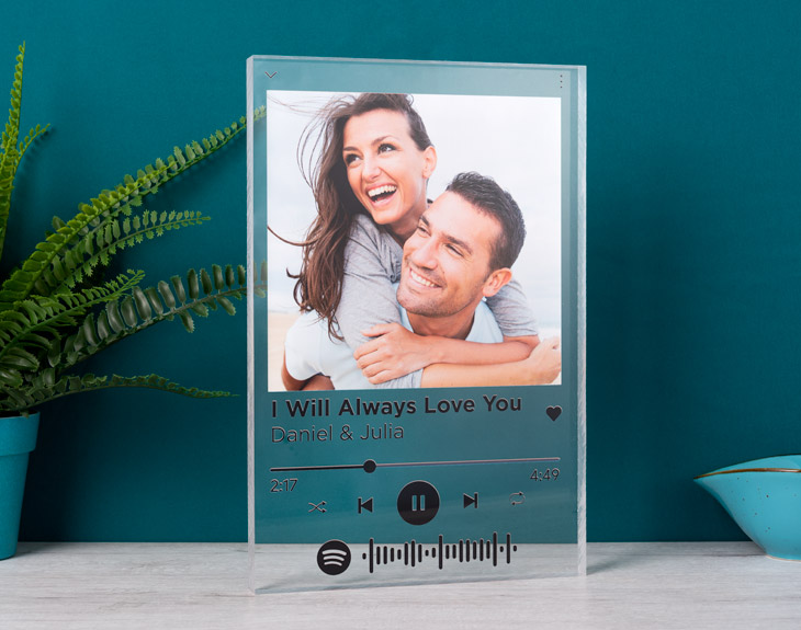 ¿Cuál es la canción que os une? Esa cuya letra parece estar escrita para vosotros, la que os hace pensar en la otra persona cada vez que suena en la radio o que os ponéis a bailar juntos en cada boda o discoteca. ¡Esa melodía os unirá para siempre! Al igual que este increíble metacrilato personalizado con el diseño de la pantalla de reproducción de Spotify. Así será como si la estuvieras escuchando a todas horas. Ya que esa canción parece estar hecha para vosotros, ¡haz que sea así de verdad! Podrás escoger la imagen y el nombre de la canción y artistas. En lugar de la de ese tema o álbum, podrás poner esa foto tan especial y vuestros nombres como si fuerais los artistas. Este no es solo un precioso regalo original para parejas en el Día de San Valentín o Aniversario. También puedes recordar ese fantástico viaje poniendo el nombre de tu grupo de amigos. Contamos con cuatro tamaños de metacrilato distintos: - 9 x 13 x 2 - 13 x 13 x 2 - 15,5 x 9,5 x 3 - 29,5 x 19,5 x 3 Importante: recomendamos no limpiar con líquidos, sólo con un paño en seco o ligeramente húmedo, y evitar los productos químicos. Importante: este producto es una réplica del diseño de reproducción de Spotify, pero NO es un altavoz. Importante: en el diseñador encontrarás la plantilla del diseño de color negro. Esto es solo para que la personalización sea más fácil y menos confusa. El metacrilato será transparente, como el que aparece en la fotografía del producto. ¿Cómo se personalizan los productos Spotify? A la hora de personalizar tus productos relacionados con Spotify, tendrás que contestar a una serie de preguntas. De esta manera… ¡tendrás un regalo original de lo más musical! Cuando llegues al diseñador te encontrarás con la plantilla del producto, con tres apartados a personalizar (texto, foto y código Spotify). Para personalizar cada uno sólo tendrás que hacer click encima de cada cuadrado de personalización. Una vez dado, solo tendrás que escribir el texto y subir la fotografía a nuestro servidor. ¡Podrás modificar el color del texto o su lugar en el diseño! En el momento de añadir esa canción tan característica, no tendrás ningún problema. Escribe la canción o el artista que quieras en el buscador del código Spotify, y a partir de ahí aparecerán una serie de resultados. Solo tendrás que pinchar sobre la canción... ¡no tendrás que hacer nada más! Dependiendo del producto, podrás modificar las características del código: color, fondo o lugar. ¿Cómo se escanea el código? Para poder descubrir de qué canción se trata tendrás que abrir la aplicación de Spotify en tu teléfono móvil y darle al apartado "Buscar". En la parte superior encontrarás un buscador, cuando pulses sobre él verás que en la esquina derecha aparece un icono de una cámara. Al pinchar te abrirá la cámara, únicamente tienes que apuntar al código y automáticamente se reproducirá tu canción.