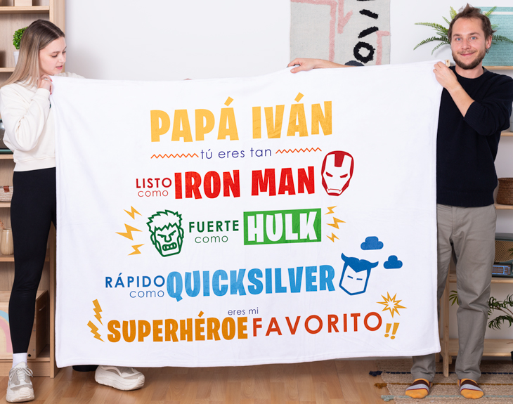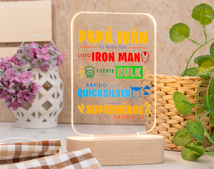 Todo el mundo adora a los grandes superhéroes de cómics y pelis gracias a sus espectaculares habilidades y a sus heroicos gestos. Sin embargo, ninguno de ellos se puede igualar al mejor héroe de la historia: tu padre. ¿Acaso alguno ha hecho tantas cosas por ti? Ni de broma. Por eso, queremos que tenga un regalo apropiado a su nivel de heroicidad, y creemos que este metacrilato personalizado es el mejor detalle posible para un padre de lo más increíble. Su fuerza es superior a la de cualquier otro de estos fantásticos hombres, su inteligencia rivaliza con la de cualquier erudito y estamos seguros de que es más rápido que nadie. Por todo esto, estamos seguros de que este cuadro de metacrilato con nombre es un detalle de lo más inesperado para tu padre. ¡Pasad un Día del padre de lo más colorido y épico gracias a este regalo original para padres! Disponible en cuatro tamaños diferentes: - 29,5 x 19,5 x 2 cm. - 15,5 x 9,5 x 2 cm. - 13 x 13 x 2 cm. - 9 x 13 x 2 cm.
