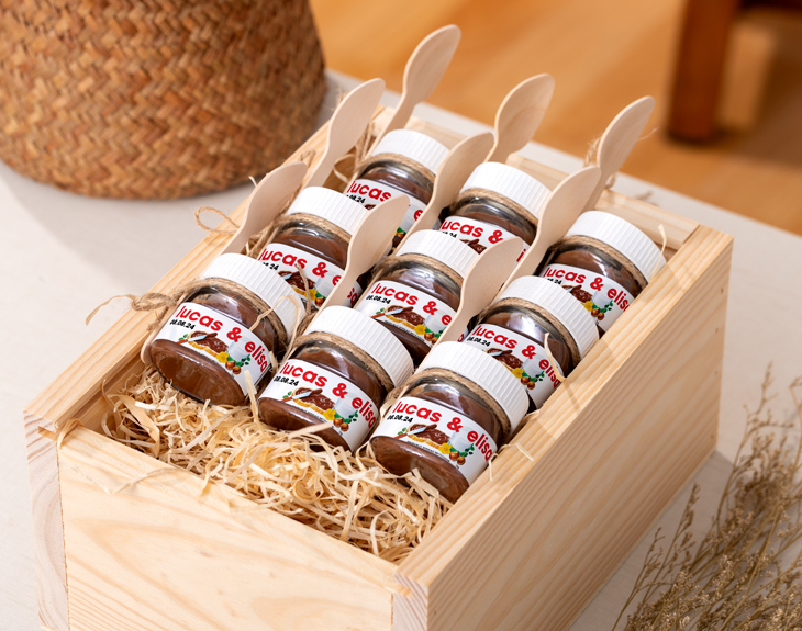 • Mini bote de Nutella 25gr personalizado. • Cuchara de madera. • Tarjeta Recordatoria.