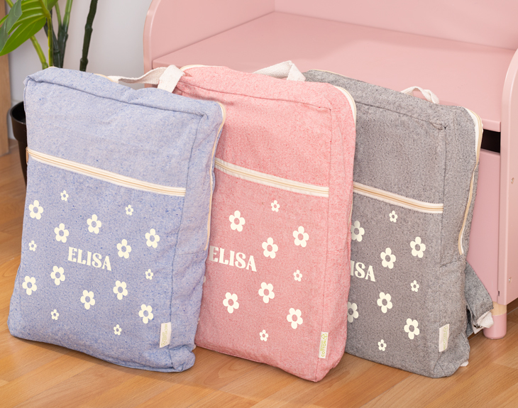• Mochila de colores de algodón reciclado personalizada. • Tarjeta recordatoria.