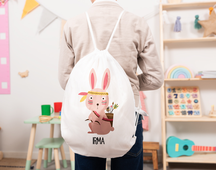 La vuelta al cole siempre se hace un poco cuesta arriba. Después de unas vacaciones increíbles lo último que apetece es volver a la rutina. Que si volver a madrugar, hacer deberes, volver a estudiar para los exámenes… Aunque la llegada de septiembre también tiene sus cosas buenas como reencontrarse con los compañeros, volver a las clases con los mejores profes o a las actividades extraescolares. Ya que ahora con la vuelta al cole va a tener que pasar mucho tiempo fuera de casa es importante que salga bien preparado y que lleve todo lo necesario. Por eso, si quieres tener un detalle con el más peque de la casa para animarle con su nueva rutina, esta mochila de cuerdas es el regalo perfecto. Se volverá su nueva compañera de aventuras, ideal para llevarla a las excursiones, a las actividades extraescolares o para llevarla al parque. ¡Siempre llevará todo lo necesario allá donde vaya! Tiene un diseño monísimo con nuestro estampado de animales de la tribu. Se puede elegir entre un mapache, un conejito, un koala o un oso pardo, elige el favorito de tu hijo y ya verás la carita de ilusión que pone. Lo más especial de todo es que es personalizable. Tú nos dices el nombre que quieres y nosotros lo ponemos en la mochila justo debajo del animalito. Para personalizarlo, lo primero es añadir el producto al carrito y entrar al área de personalización. ¡Quedará perfecto! Medidas: 34,5 cm x 41 cm. Material: suave poliéster 210T