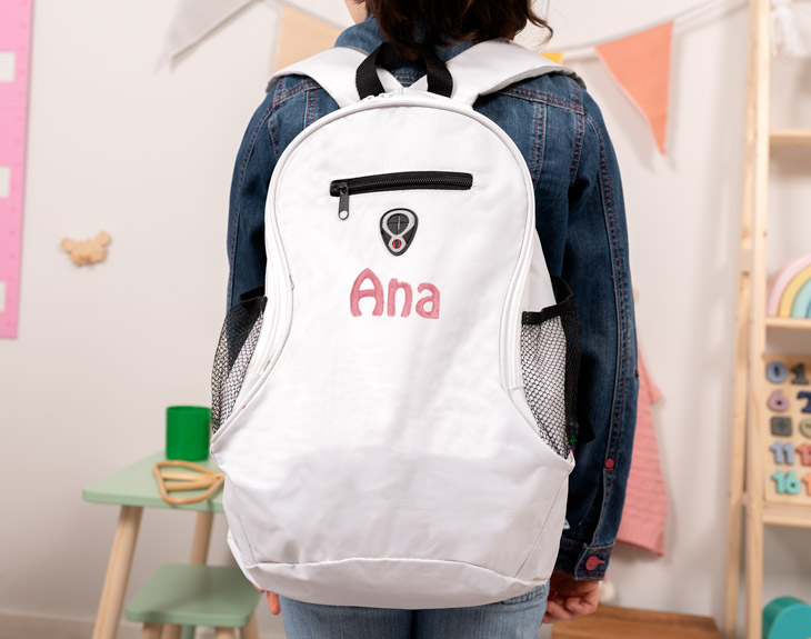 Mochila deportiva con tu nombre. Además del compartimento principal, tiene un bolsillo pequeño y dos laterales. Medidas aproximadas: - Altura: 38cm. - Ancho: 30cm.