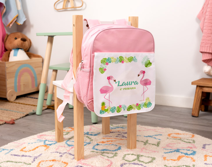 Si a tus hijos les encantan los animales más bonitos, alégrales cada mañana que vayan al cole con la mochila infantil de Flamencos personalizada más divertida. Con este regalo tan original, irán al colegio, a clases o a hacer deporte bien contentos con su diseño a juego y el espacio suficiente para llevar todo lo que necesiten. Personaliza la mochila para que la sienta suya con su nombre y apellidos o la clase a la que irá este año... Puedes escribir lo que quieras. ¡Verás lo que disfruta al ver su nombre tan colorido en su mochila única y personal! Escoge entre azul o rosa para el color de la mochila entera y sorprende a tu niña o tu niño su nombre y diseño particular, solo para ella o él. ¡Así aprenderán a ser responsables de sus cosas! Medidas aproximadas: 32cm x 26cm