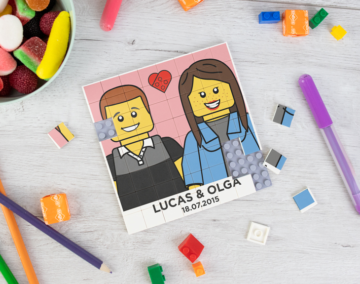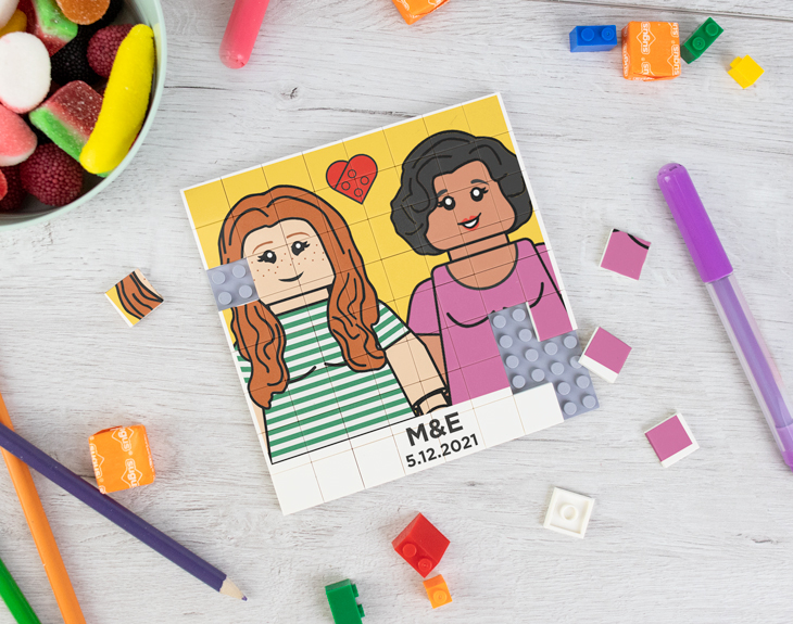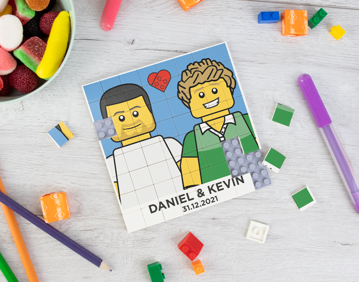 Se acerca la época más bonita del año... ¡El día de los enamorados! Todo se llena de corazones y muuucho amor. Si este año quieres sorprender a tu pareja, está claro que tienes que hacerle el regalo más romántico de todos. Por eso, nuestro mosaico de bloques personalizado con diseño "Pareja Lego". ¡Será el mejor detalle para esta ocasión! Lo mejor de este mosaico de bloques es que es personalizable. Tú eres el creador de estos avatares Lego tan chulos. Hay un montón de rasgos y accesorios diferentes disponibles para elegir, seguro que consigues que estos lego os representen. Este mosaico está formado por 64 piezas de bloque, que juntas conforman una imagen donde podrás añadir tu muñecos Lego. Estas piezas tendrán que unirse en la placa cuadrada de color gris, de 13 centímetros cada uno de sus lados. Personalizar este mosaico de bloques es súper sencillo. El primer paso a seguir consiste en añadir el producto al carrito y entrar al área de personalización. Una vez ahí, ya puedes crear a estos avatares desde cero. ¡Ya verás que divertido! Pronto estará perfecto y listo para regalar. ¡Será un original regalo para fans de Lego! Medidas: 13 x 13 cm.