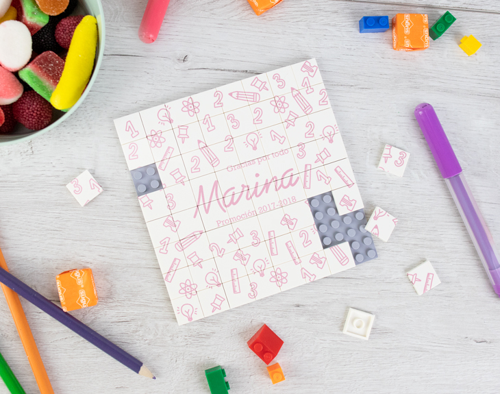 Paciencia, vocación, cariño, amor, conocimientos, enseñanza... Todas estas palabras y acciones forman al mejor profe del mundo. Si este año habéis tenido la suerte de contar con un profe que tiene todas estas características, os encantará sorprenderle con nuestro mosaico de bloques personalizado. Si sabes que a vuestro profe le encantan los puzzles y rompecabezas, este será el más especial de todos. Hecho con mucho cariño por sus alumnos para que nunca se olvide de esas personitas a las que tanto ha enseñado. Los puzzles sirven para entrenar nuestro cerebro y nos enseñan a buscar y a ser pacientes para intentar resolverlos. Por eso, este original juego de piezas de construcción le encantará a vuestro profe. Es el mejor regalo que le podéis dar el último día de clase para agradecerle todo lo que ha hecho por vosotros durante este año. Pero este puzzle es súper especial porque su diseño está hecho especialmente para todos los profes del mundo. Seguro que le encanta resolverlo cuando llegue a casa después de un duro día de trabajo. ¡Le servirá para relajarse siempre que quiera! Un profe como el vuestro se merece un regalo único y por eso no os podéis olvidar de personalizar este puzzle. Tendréis que elegir qué color os gusta más para el diseño y después rellenar los espacios vacíos con el texto que queráis. Os podéis fijar en nuestra imagen o dejar volar vuestra imaginación y poner lo que le queréis decir a vuestro profe. Cada vez que intente resolver este puzzle en casa se acordará de los alumnos tan geniales que ha tenido y con los que ha compartido días muy bonitos. Medidas: 13 x 13 cm. El bloque incluye 64 piezas.