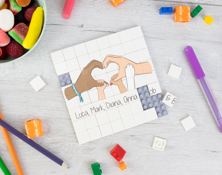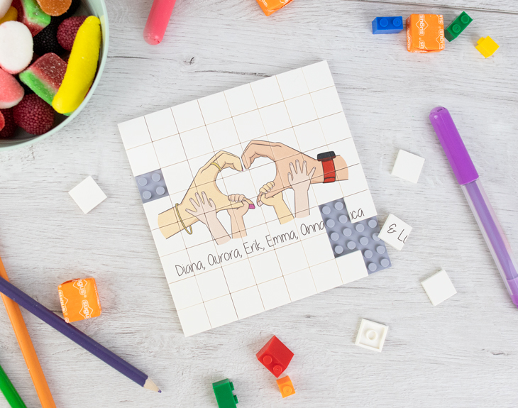 Si quieres sorprender a cualquier miembro de tu familia con un regalo único y muy divertido, este mosaico de bloques personalizado es perfecto. Si sois la típica familia que pasa mucho tiempo juntos y os encanta jugar a juegos de mesa o resolver puzzle, este mosaico os encantará. Podréis jugar con este puzzle para saber qué imagen y mensaje se esconde en cada bloque. Para eso, tendréis que desmontarlo y volver a juntar todas las piezas en familia. ¡Pasaréis un rato súper divertido todos juntos! Para sorprender a papá, mamá o tus hermanos en ocasiones especiales como cumpleaños o el Día de la Madre o el Padre, este original juego de piezas de construcción es ideal. Les encantará recibir este divertido pasatiempo para toda la familia con un diseño único y de lo más entrañable: unas manos que forman un corazón y simbolizan la familia. Además, este regalo es compatible con Lego, así que podrás añadir más piezas o cambiar unas por otras si quieres. Antes de recibir tu regalo, tendrás que personalizar este mosaico de bloques. Añade el producto al carrito y entra en el apartado de personalización. Ahí podrás personalizar tus manos, añadir manos más pequeñas o patitas de mascotas y todos los detalles necesarios. Por último, escribe los nombres de todos los miembros de la familia y listo. ¡Este puzzle está esperando ser resuelto! Importante: Podrás crear el diseño desde cero, eligiendo todos los detalles necesarios (color de la piel, accesorios para las manos, mezclar manos con patitas de gato o perro, pintar las uñas) Medidas: 13 x 13 cm. El bloque incluye 64 piezas.